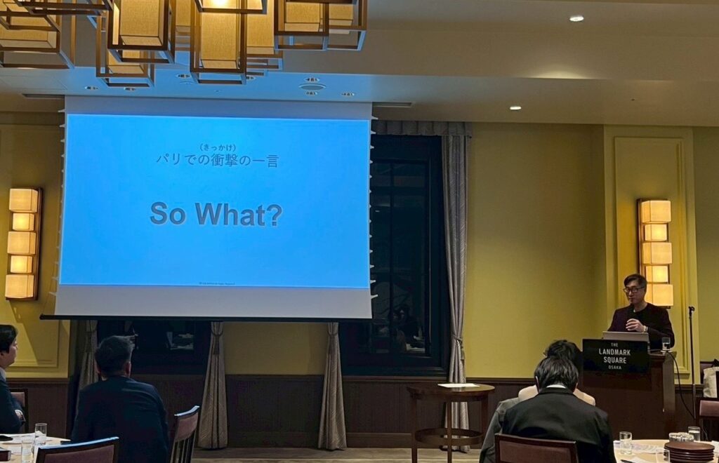 2026年1月7日、大阪城内のランドマークスクエアで開催されたSBGの本年初回の例会に、COS KYOTO代表の北林が登壇しました。