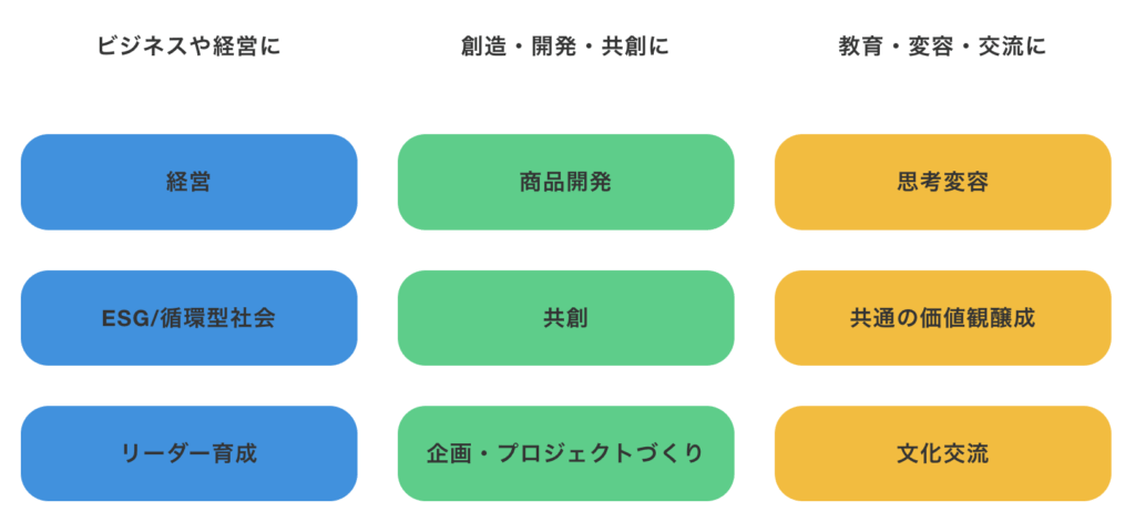 経営や教育、パーパス策定、共創プロジェクト、商品開発など、現場での体験を自組織に活かすアクションへと接続します。